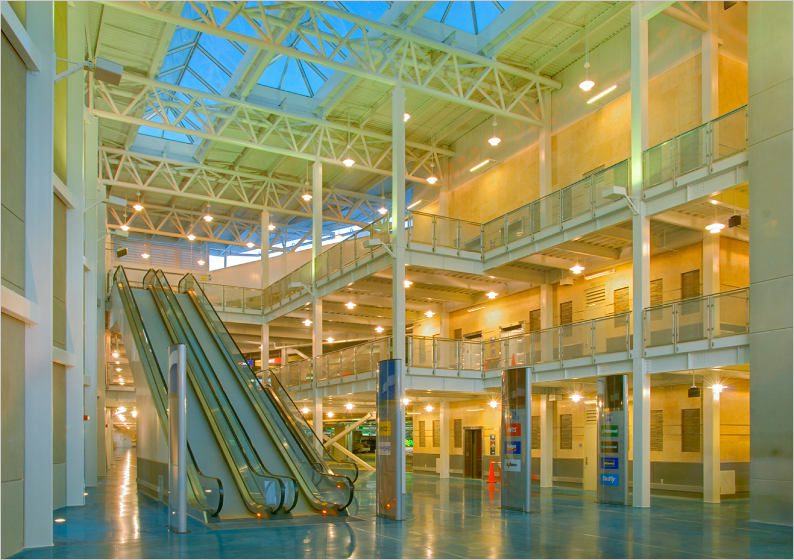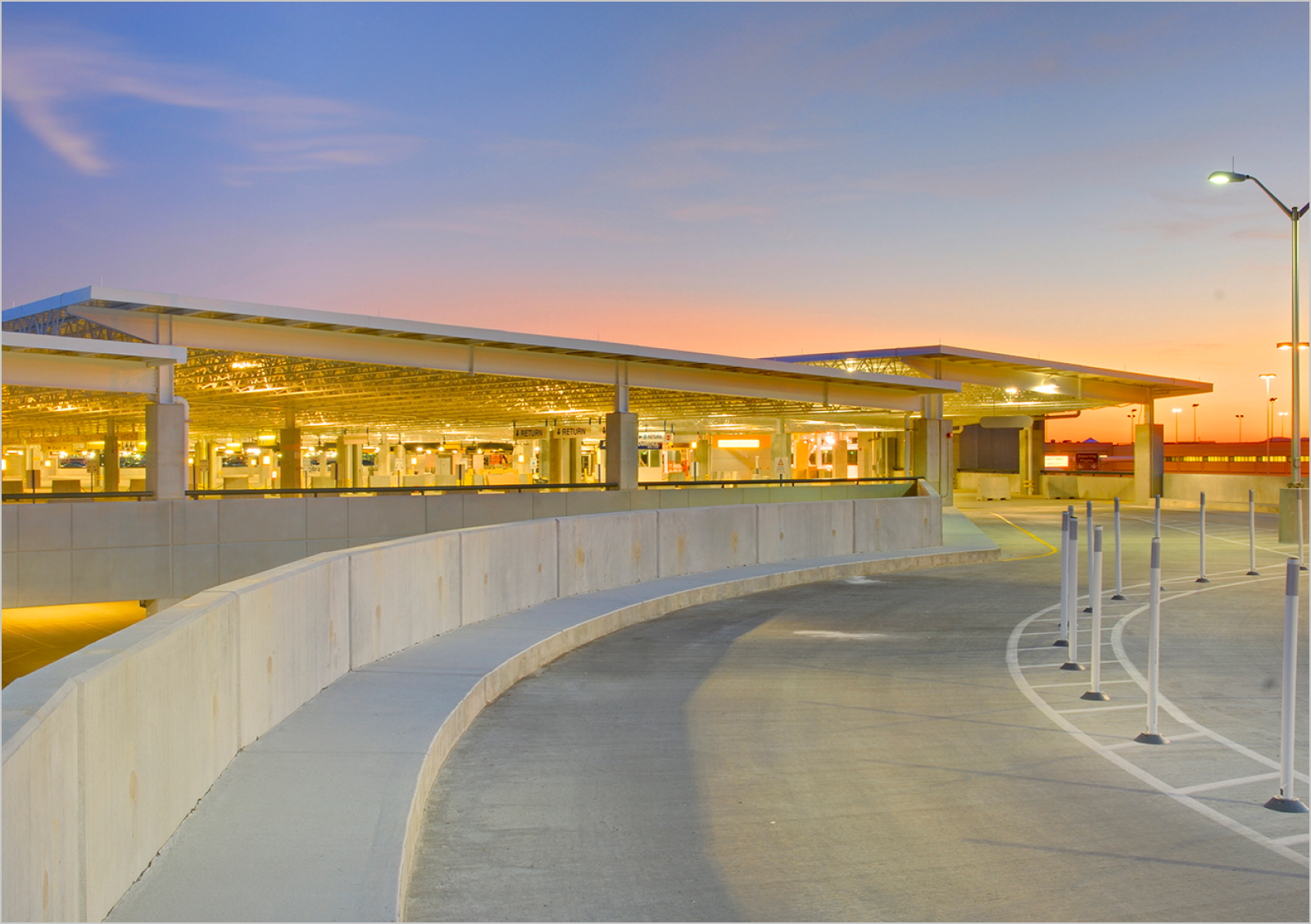 The facility includes a three-story precast concrete garage with 2400 car stalls, 1- story precast car fueling/ maintenance facility with parking for 800 cars above, a cast in place concrete helical ramp way, a post tensioned concrete entry and exit ramps, and a three-story steel frame customer access building.